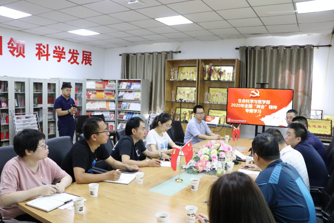 为深入学习宣传2020年全国两会精神,引导广大师生党员同志深刻领会、准确把握两会精神实质,切实增强师生党员的政治责任感和历史使命感,生命科学与医学部自6月中旬以来开展“学习两会精神,勇担青春使命”“两会”精神系列学习活动。活动遵循“接地气、广参与、出实效”的原则,充分运用新媒体技术引导党员关注两会动态、学习两会精神。各学生党支部召开党组织生活会,聚焦“两会”热点、要点、亮点,确定本支部学习讨论话题。通过学院微信公众平台发布各支部学习讨论话题,票选出三个“最话题”。根据围绕选定的三个话题,各支部结合政府工作报告改革重点、社会热点事件,组织党员、预备党员、积极分子展开分阶段、分类别、分层次的深入讨论,形成学习报告。在总结交流会上,围绕“战胜疫情,展现深刻文化精神”“建议将HPV疫苗纳入国家免疫规划”“保护隐私”三个“最话题”,各支部代表进行学习总结汇报。6月30日,学部召开专题学习讨论会,班子成员张宇、关锋、付爱根、李方民、杨涛、陈凯、张杰,学部师生党员代表参加会议,将学习两会精神和学习习近平总书记在陕考察重要讲话精神紧密结合,深刻领会核心要义和工作要求,统一思想认识,凝聚工作共识。