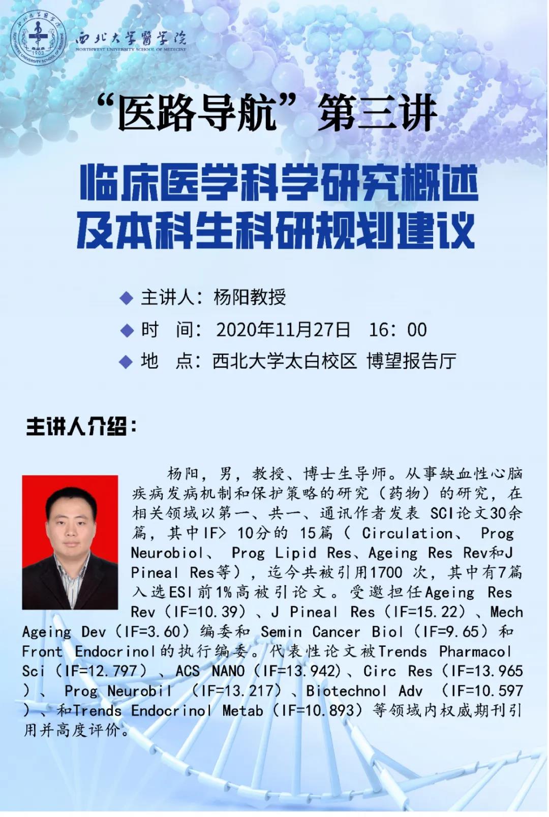 2020年11月27日,学院邀请学部教授、博士生导师、2020级生物医学科学班班主任杨阳为开云kaiyun官方网站全体学生做“临床医学科学研究概述及本科生科研规划建议”学术报告。本次讲座旨在指导医学生深入了解科学研究的目的和方法、进一步理解临床研究的重要性,指导学生树立严谨的科研态度,引导学生尽早尽快找准方向,走上科研探索之路。