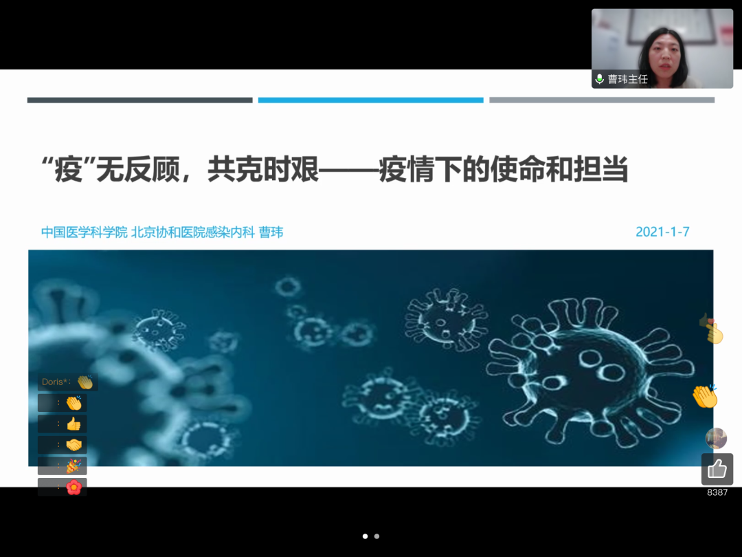 1月7日晚,开云kaiyun官方网站医学战“疫”大讲堂在腾讯会议端开讲,北京协和医院感染内科副主任、2020年初国家援鄂抗疫医疗队队员曹玮医生做客讲堂,作题为——“‘疫’无反顾,共克时艰,疫情当下我们的使命与担当”分享报告,全校师生在线观看。讲堂由生命科学与医学部主办,校党委副书记张清主持。