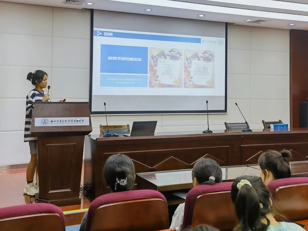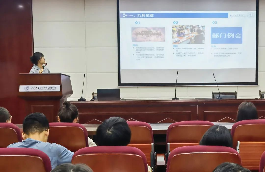 文艺部工作人员王子琪对九月的迎新活动以及部门例会进行了简单的总结,并汇报了部门十月以及本学期工作计划。她希望志愿者们能通过学生会的每次活动,集思广益、加强交流、团结协作,不断提高自身综合能力。