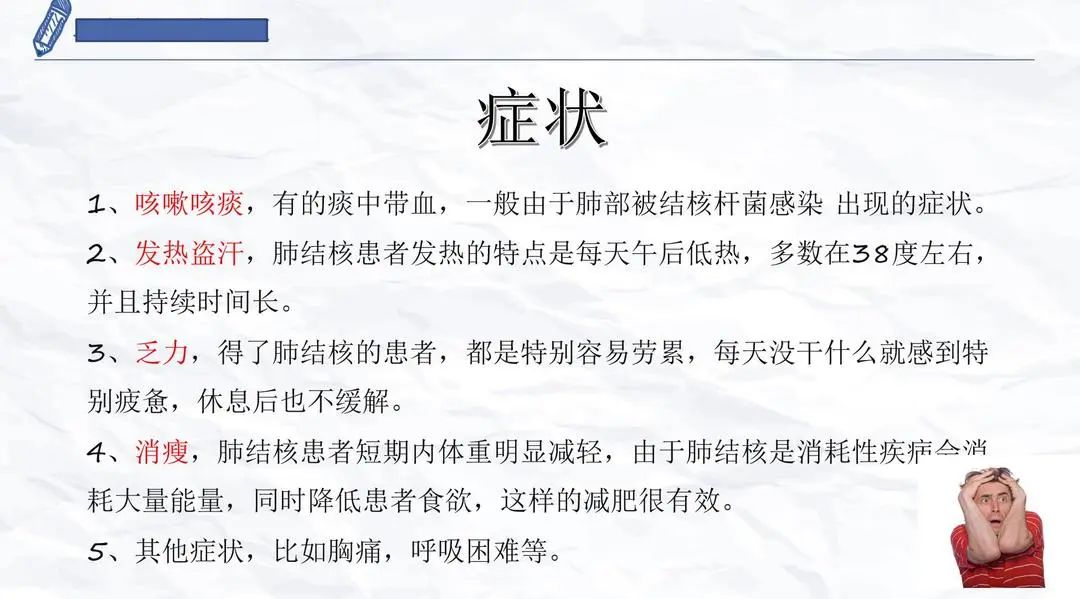 预防手段:结核病是一种可以预防的慢性传染病,采用疫苗预防是最好的策略,目前广泛使用的疫苗是卡介苗。另外,减少患者的接触、增强体质有一定效果。
