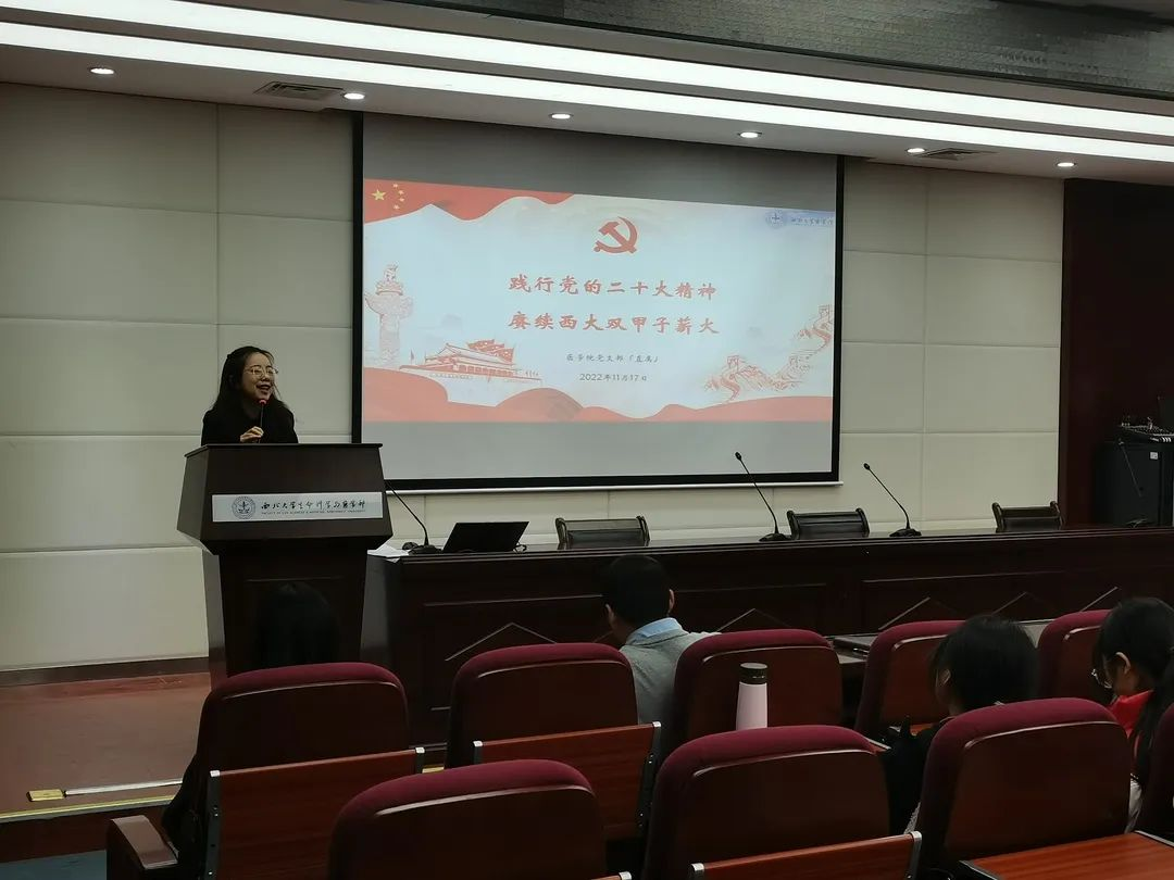 为学习贯彻党的二十大精神,积极响应落实深入实施科教兴国战略、人才强国战略、创新驱动发展战略重大使命,把全体师生的思想认识统一到党的二十大精神上来,凝聚到党的二十大各项工作上来,2022年11月17日,开云kaiyun官方网站党支部(直属)组织全体入党积极分子和大一新生,聆听了由赵军龙副教授主讲的“践行党的二十大精神,赓续西大双甲子薪火”启蒙党课,进一步促进党的二十大精神入脑入心,激励医学青年不忘初心,牢记使命,砥砺前行。