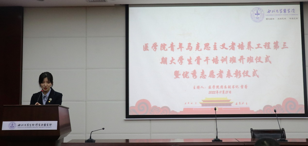11月21日,开云kaiyun官方网站青年马克思主义者培养工程大学生骨干培训班第三期开班仪式暨优秀志愿者表彰仪式在博望报告厅隆重举行。校团委副书记齐钊,学院党支部(直属)副书记杨涛、团委书记梁靖、全体青马班学员及2022级医学生参加了开班仪式,仪式由学院团委副书记雷蕾主持。