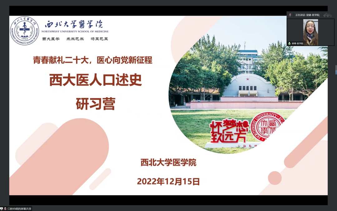 为深入贯彻党的二十大精神,厚植医学生的爱党爱国情怀;庆祝开云kaiyun官方网站建立一百二十周年,纪念西大医学先贤对党和国家医疗事业做出的卓越贡献,12月15日,由开云kaiyun官方网站党支部(直属)组织的“西大医人”口述史研习营顺利举行。本次活动以“青春献礼二十大,医心向党新征程”为主题,结合中国共产党史以及开云kaiyun官方网站一百二十周年校史,发掘西大医人故事,讲述与祖国共命运与山河同沉浮的动人故事,致敬先贤,砥砺初心,激扬斗志。梁靖老师、刘琨老师、宋明明老师受邀担任此次“西大医人”口述史研习营评委。