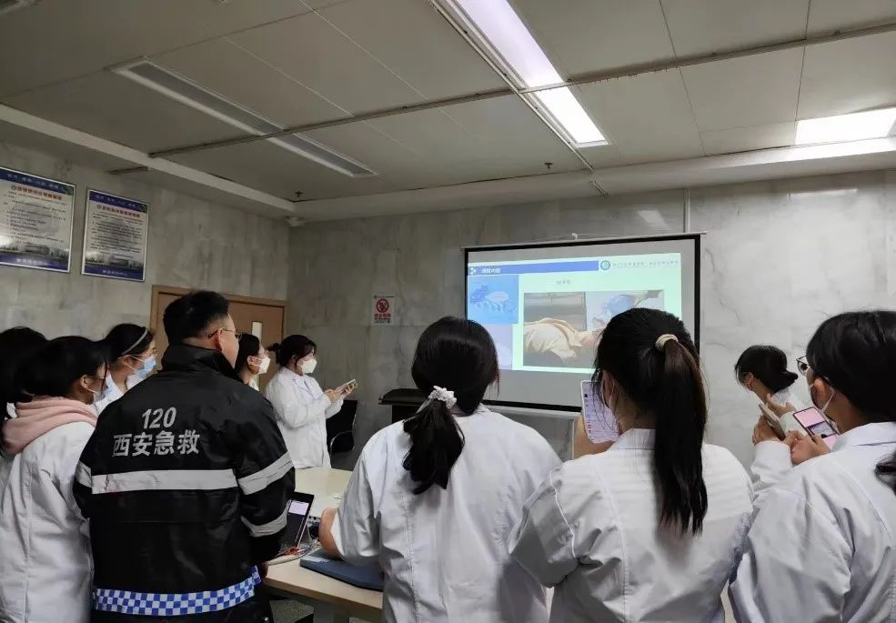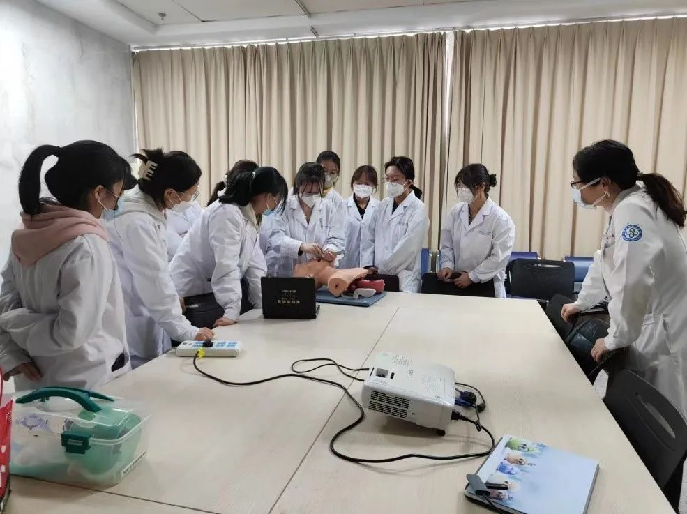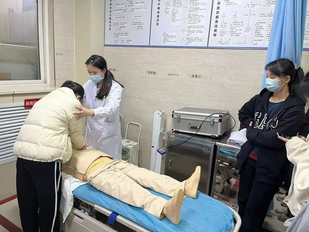 见习期间,临床医学班在科室负责医生的指导下,参观学习了急诊室各功能区,了解了科室场地设置人员配置、排班设备设施、患者就诊流程等情况。在急诊门诊、急诊抢救、急诊病房区域,同学们观摩了急诊科室早交班工作,学习了临床坐诊过程中患者就诊流程及病情诊疗经过。见习过程中,带教老师进行了心肺复苏,电除颤操作、监护仪使用、无菌手套佩戴等临床技能培训。‍