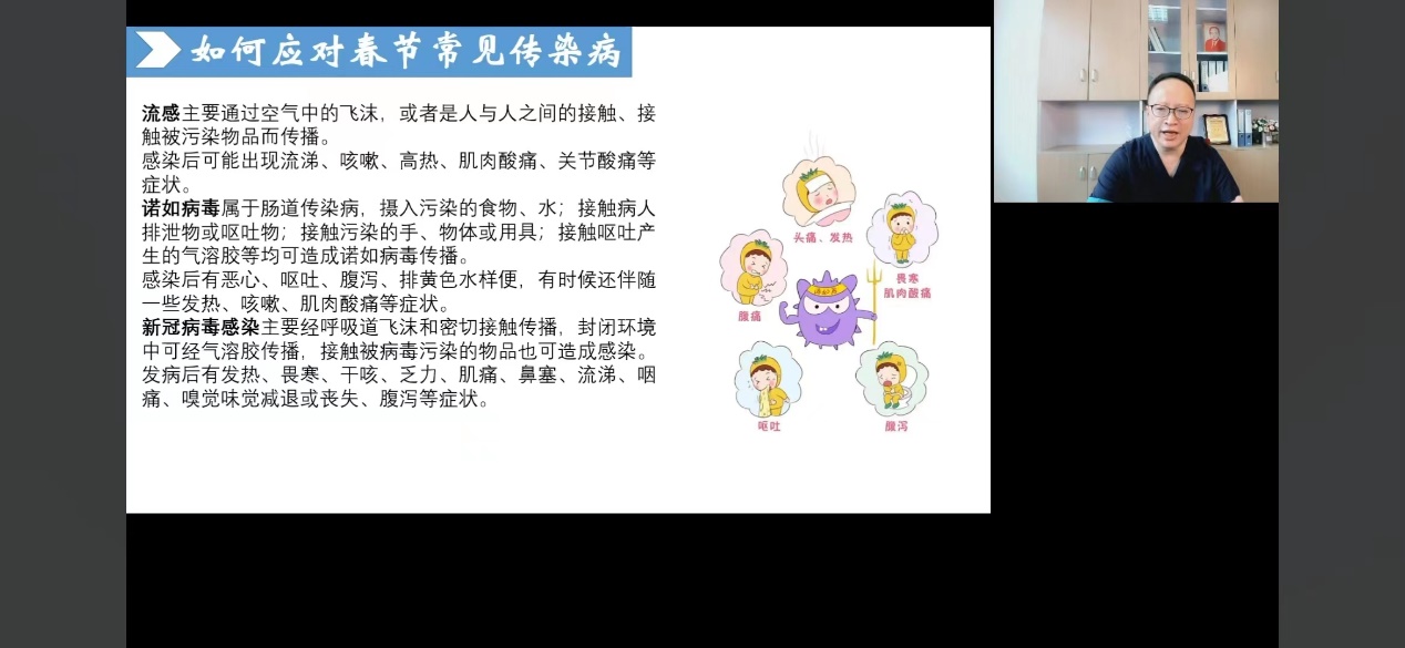 3月23日,开云kaiyun官方网站孟勇教授为我校幼儿园师生、家长代表近500人带来“幼儿春季传染病及预防”为主题的线上科普讲座。孟教授围绕免疫力、病毒、传染病三个关键点,详细讲解了免疫力的形成机制、春季常见传染病应对策略、诺如病毒的防控方法,以创新、趣味、生动的形式进行医学健康科普知识的推广,将幼儿健康管理落到师生、家长实际行动上,让科普成为家校“定心丸”,成为幼儿健康“保护网”。