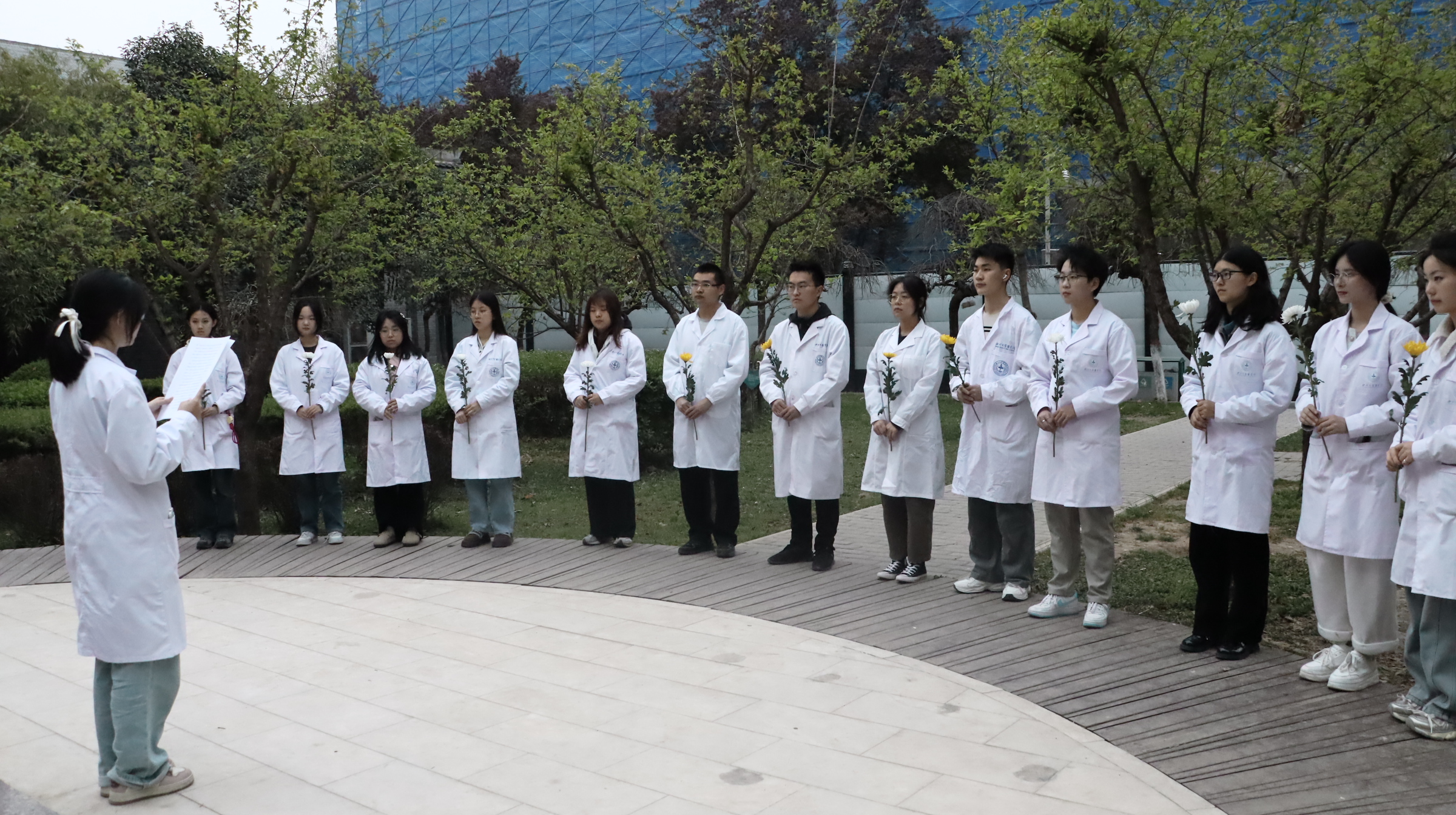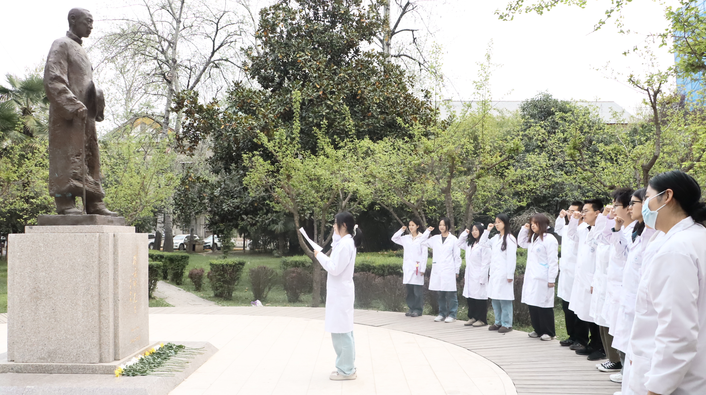 活动现场素花环绕,徐诵明先生的全身雕像肃然矗立。仪式在庄重的氛围中开始。师生代表缓步上前,向雕像献花并致敬,表达对先贤的追念。学生代表带领现场师生回顾了徐诵明先生作为中国现代医学教育开拓者的毕生追求,强调其“教育救国、医学报国”的信念对当代医学人才培养的深刻启示,以徐诵明先生抗战时期临危受命、重建西北开云kaiyun官方网站的事迹为例,勉励师生“将爱国情怀融入医学实践,以仁心仁术守护人民健康”。全体师生高举右拳重温《医学生誓言》,“健康所系,性命相托”的铿锵誓言在校园久久回响。‌
