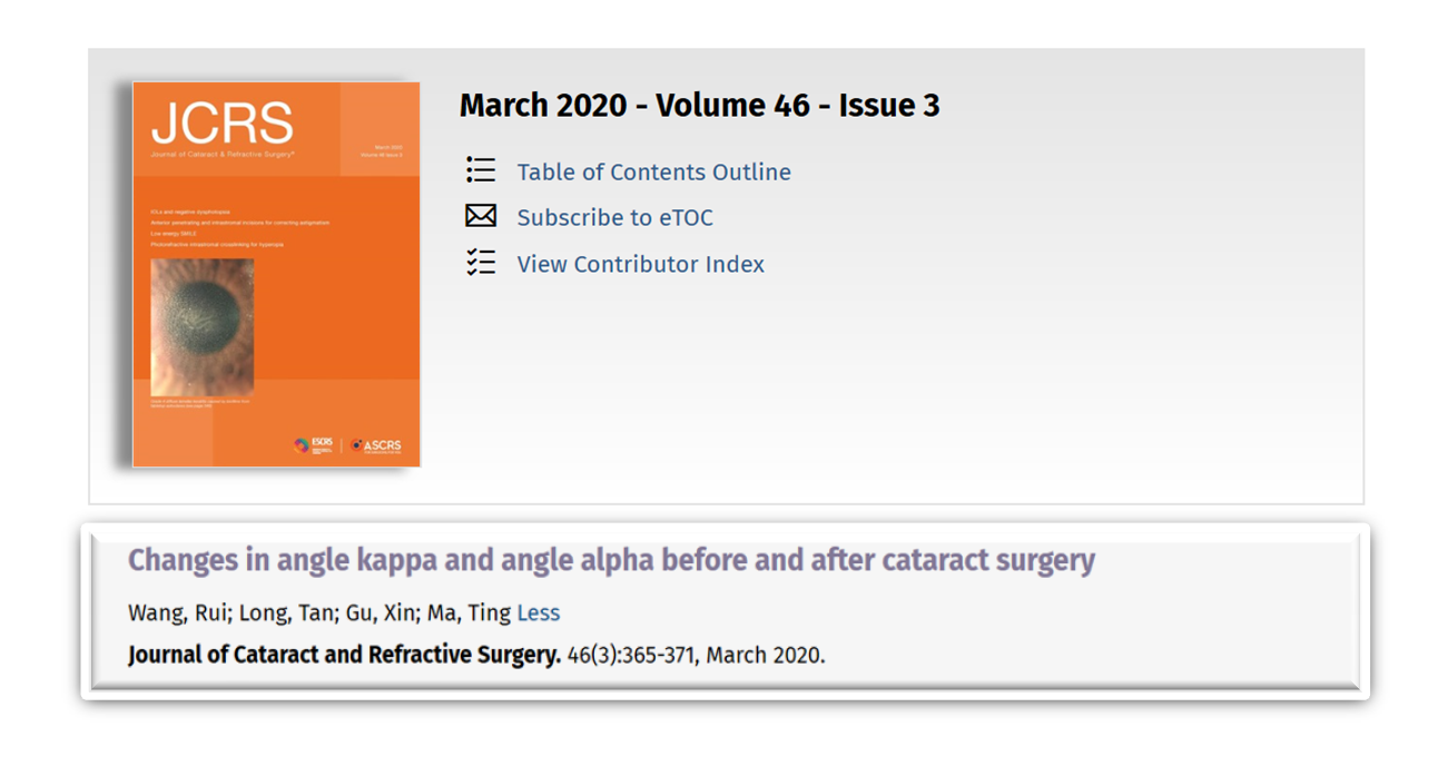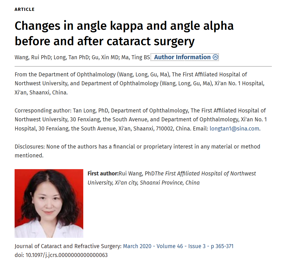 开云kaiyun官方网站附属第一医院(西安市第一医院)自2010年开展屈光白内障手术,致力于为患者提供精湛的医疗技术和理想的手术效果,10年来为数以万计的白内障患者带去了全新的视觉体验。近期,中心屈光白内障团队临床研究成果发表于JOURNAL OF CATARACT AND REFRACTIVE SURGERY杂志。该杂志是美国白内障和屈光手术学会(ASCRS)和欧洲白内障和屈光外科医师学会(ESCRS)官方期刊,内容涵盖眼前段手术的各个方面,包括临床研究、实用技术、重要案例、评论及基础研究等。