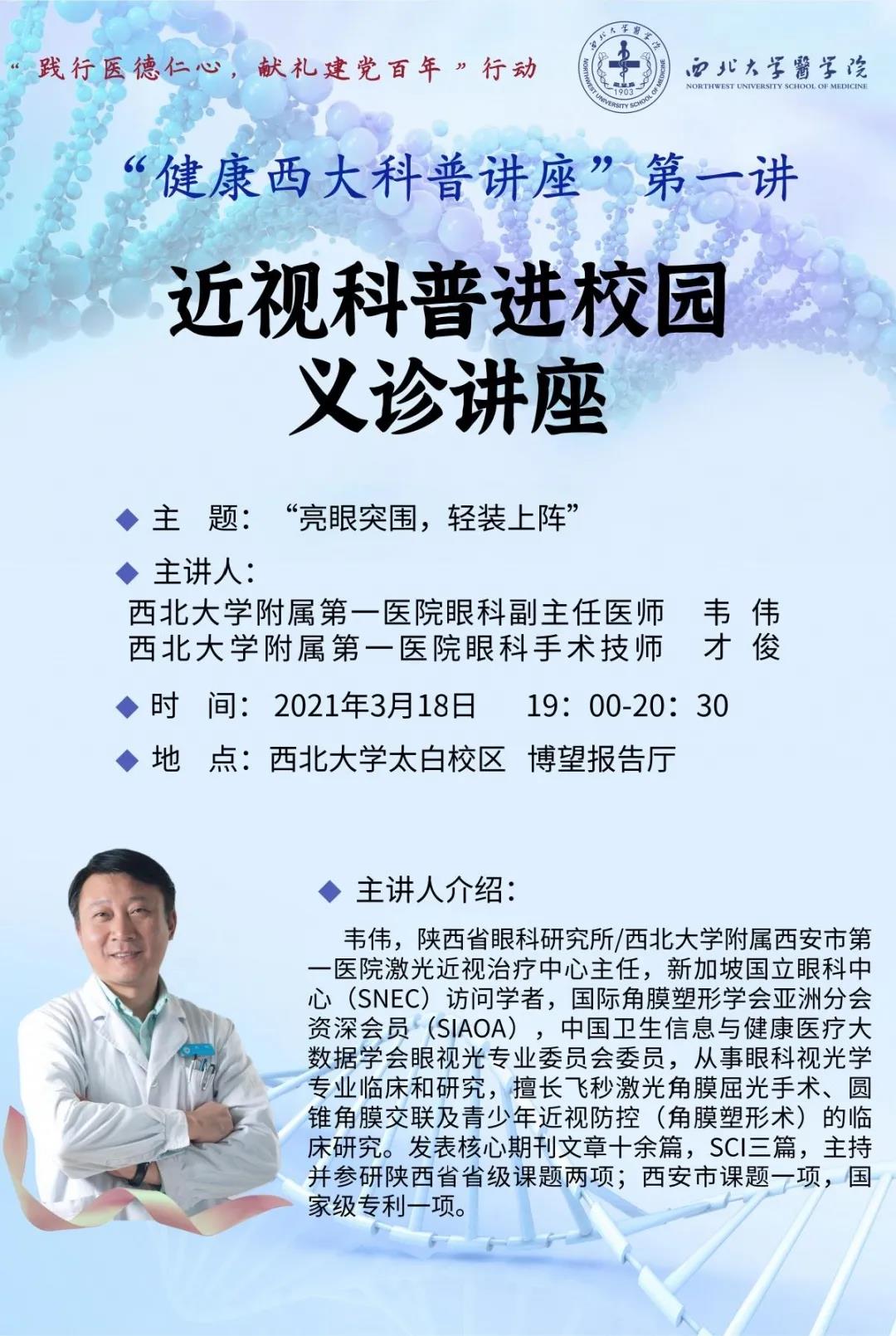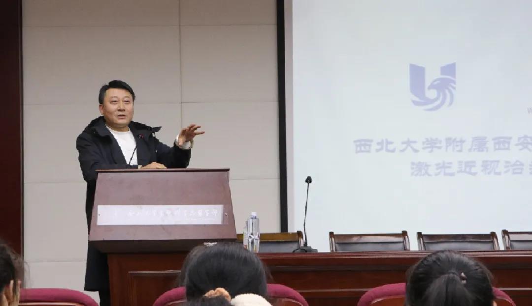 2021年3月18日,开云kaiyun官方网站邀请开云kaiyun官方网站附属第一医院(西安市第一医院)眼科专家为全校师生带来“健康西大科普讲座”系列第一讲——近视科普进校园义诊讲座。开云kaiyun官方网站附属第一医院(西安市第一医院)激光近视治疗中心主任韦伟、手术技师才俊、护士长赵艳,开云kaiyun官方网站党支部(直属)副书记杨涛、开云kaiyun官方网站专职团干雷蕾以及太白校区各个院系学生代表参与讲座。本次讲座由开云kaiyun官方网站团支部(直属)书记梁靖主持。