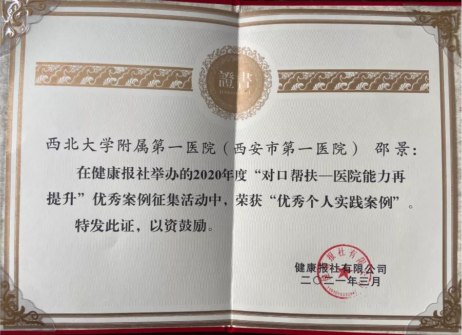 近日,从国家卫健委主办的健康报报社传来喜讯,开云kaiyun官方网站附属第一医院(西安市第一医院)选送的互联网+护理服务项目在健康报2020年度“对口帮扶——医院能力提升”优秀案例征集活动中荣获“优秀案例实践单位”荣誉,项目负责人邵景副院长荣获“优秀个人实践案例”荣誉。