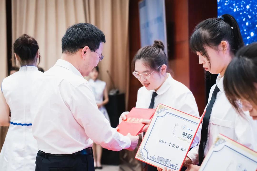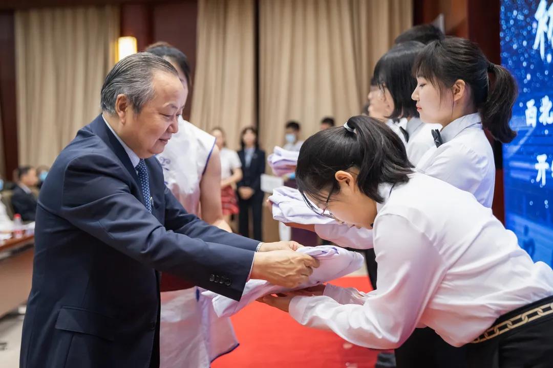 赵铱民为医学新生授予医学白袍,用满满仪式感激励新生在医学道路上砥砺前行。