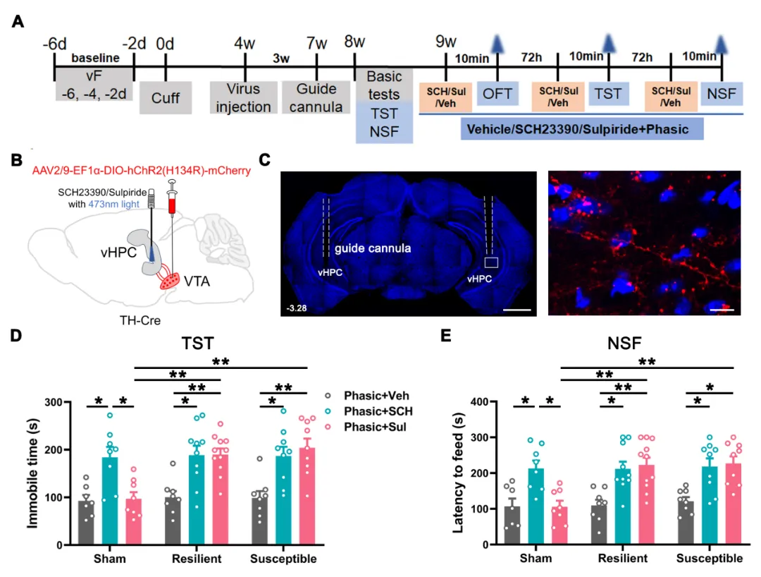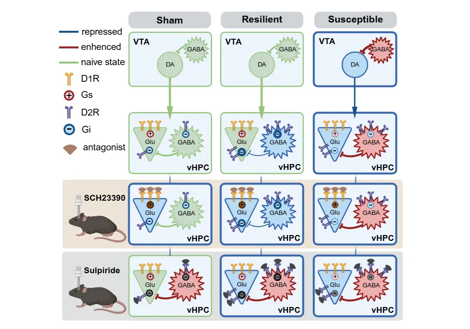 图3 VTADA-vHPC通路通过D1R和D2R发挥抗抑郁作用