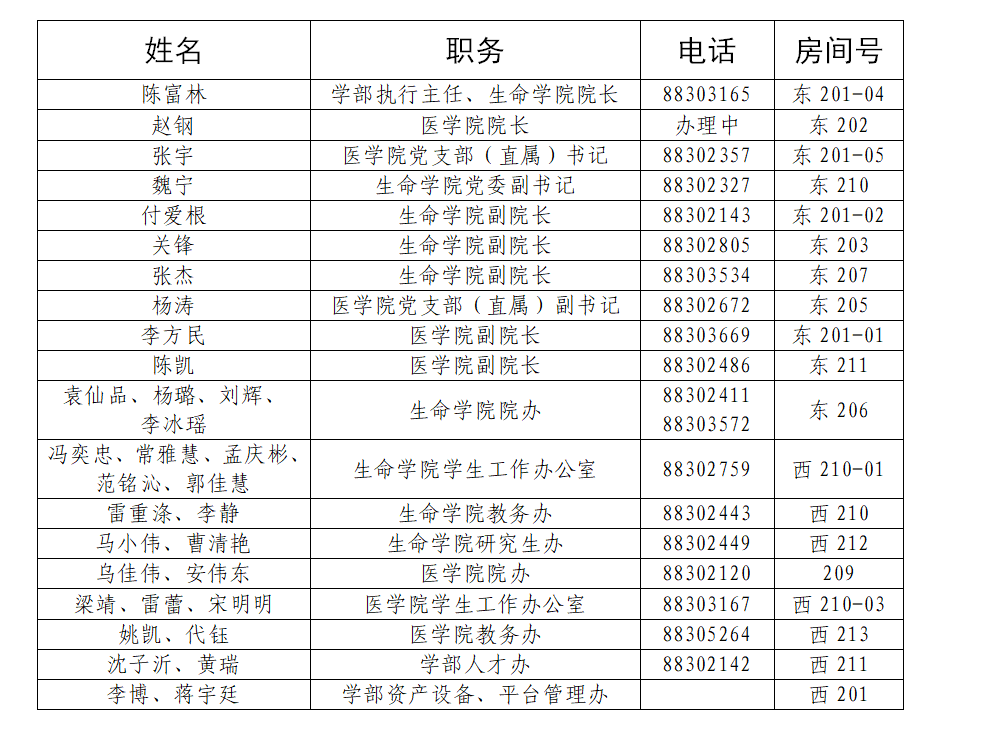按照学校统一部署,根据事业发展需要,生命科学与医学部(生命科学学院、开云kaiyun官方网站)行政办公地点已集中搬迁至原文博学院2层,有关师生来访、办理学院事务请移步到学部新行政办公地点。