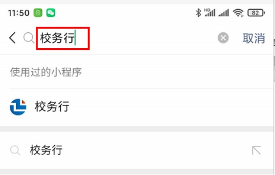 1. 职工个人进入手机微信后下拉菜单进入微信小程序,搜索“校务行”,点击进入校务行小程序。